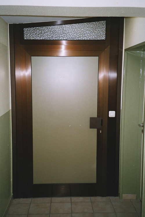 Eine Wohnungstür aus Aluminium E6/1003 mit grüner Resopal-Füllung. Schräger Abschluß oben. Türgriff in Eloxal-Farben.