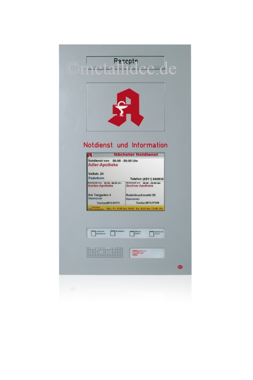 Bild rechts: Apothekenanlage mit integriertem Display-System "GA3color" und vier berührungslosen Tasten zur Auswahl von verschiedenen Anzeigen, für Montage im Türseitenteil, Front aus pulverbeschichtetem ALU.