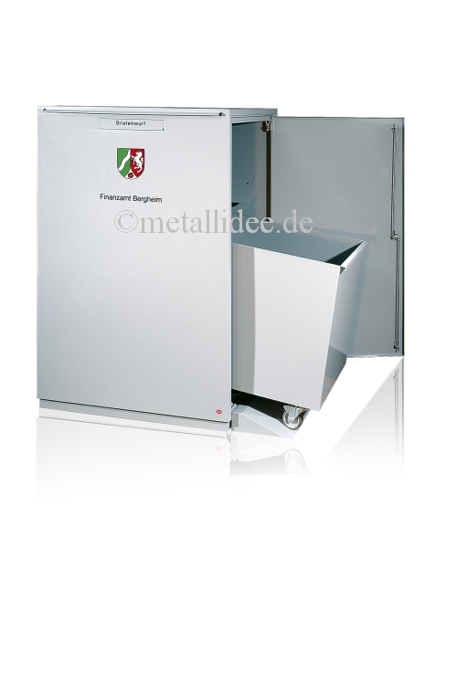 Bild rechts: Sonderbriefkastenanlage mit Entnahmesicherungsblechen, Kastenformat 1000 x 1500 x 500 mm, 3 mm ALU-Tür, 3-Punkt-Verriegelung mit Aufbohrschutz, Eingravur, fahrbarer Postkorb mit Auffahrrampe, Koffereckenverkleidung (schwere korrosionsgeschützte und pulverbeschichtete Stahlblech-Ausführung, 2 mm Materialdicke, fugenlos geschweißt).
