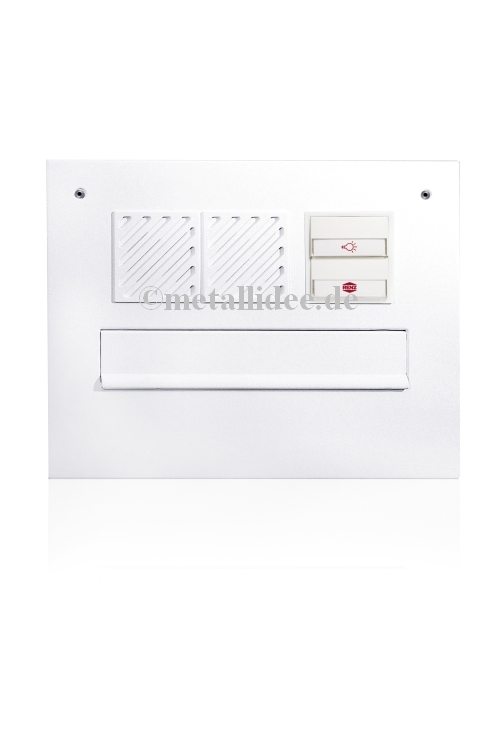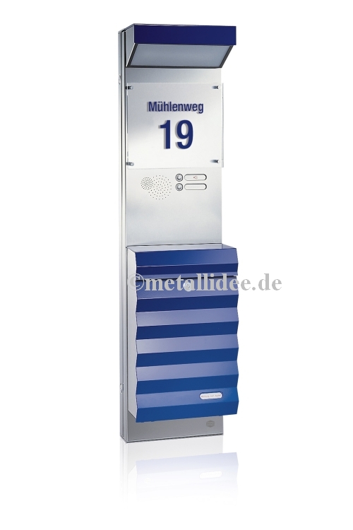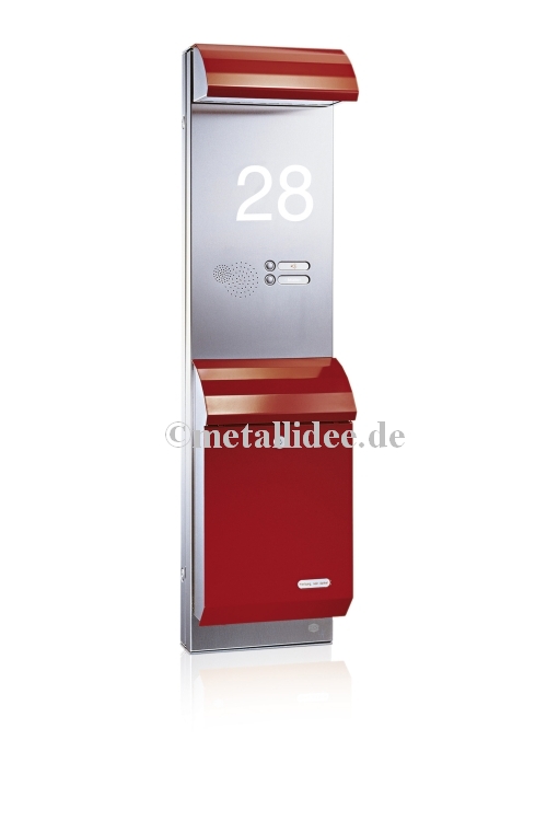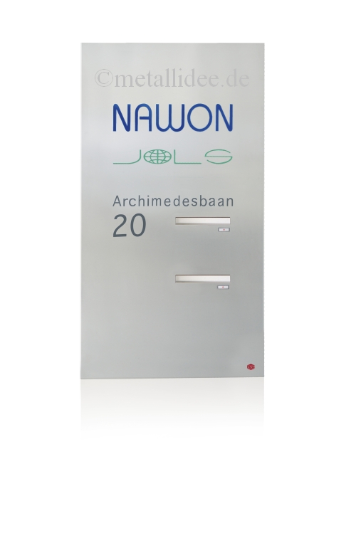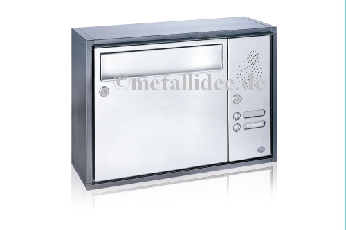 | Briefkasten Sonder #18 - Bild links: Edelstahl-Wandelement ähnl. Modell 15-0-15167. Mit RSA, Lampe und Kasten Modell Volta, Sonderausführung: Klappe und Tür pulverbeschichtet, Hausnummer eingraviert,