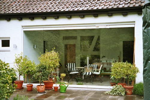 Eine Abtrennung von der Sauna/Pflanzenwelt zur Gartenanlage 5-tlg. mit Glaselementen zum Schieben.