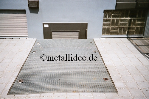 Gitterrost-Sicherungen von oben. Mit HEA 100 Träger zur Abstützung und innen mit Steigeisen.