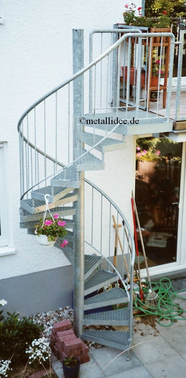 Eine Spindeltreppe aus verz. Stahl vom Balkon oben zur Terasse unten,