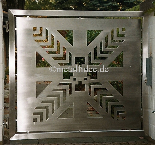 Ein 1-flg. Gartentor aus Edelstahl Vierkantrohr mit Füllung Lochmuster (nach Kundenwunsch).