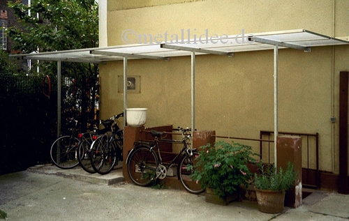 Eine Überdachung aus verz. Rohr mit Doppelstegplatten und Alu- Abschlußprofilen. Abschluß an der Wand mit einem Aluwinkel. Kombinierter Unterstand für Fahrräder und Kellerabgang.