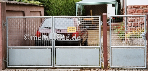 Ein verz. 2-Flg. Tor mit Wellengitterfüllung und Blecheinsatz. Passend dazu die Eingangstür.