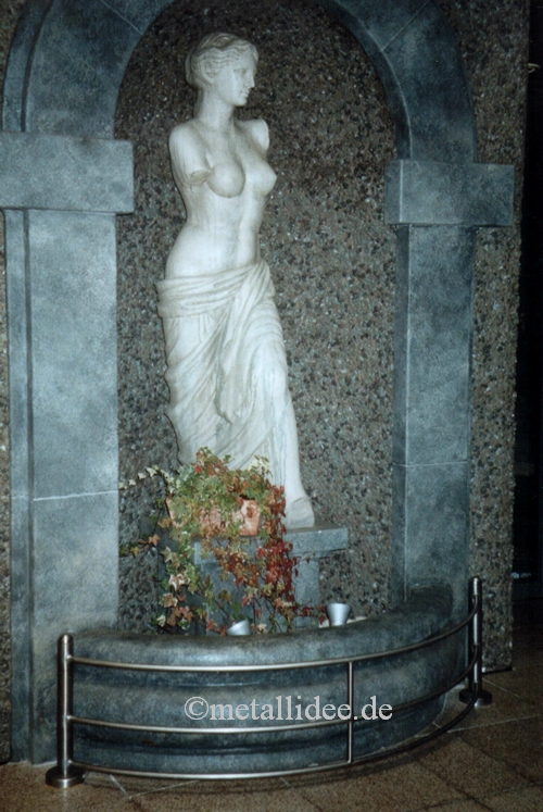 Ein Rammschutz für eine Figur. 3 Rundrohr Pfosten und Streben aus Rohr 16 x 2mm gebogen. Befestigung mit Dübel im Boden.