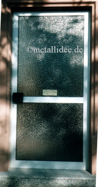 Eine Hauseingangstür aus E6/EV1 elox. Aluprofilen mit einer Sprosse. Füllung Drahtglas.